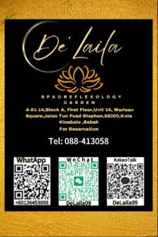 Alamat: Block A, First Floor, Unit 14, De' Laila Spa & Reflexology Garden 마사지, Warisan Square, Jalan Tun Fuad, 88000 Kota Kinabalu, Sabah, Malaysia.